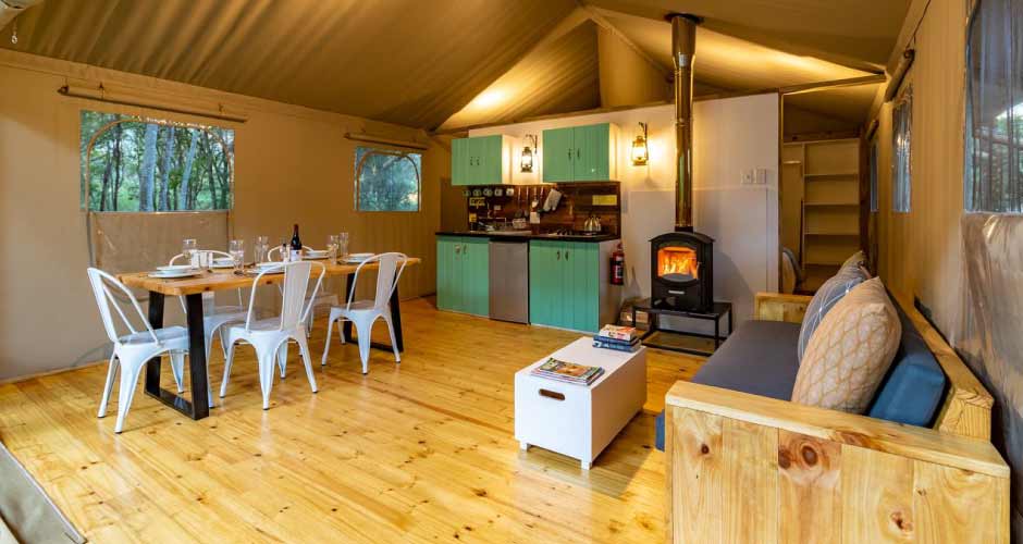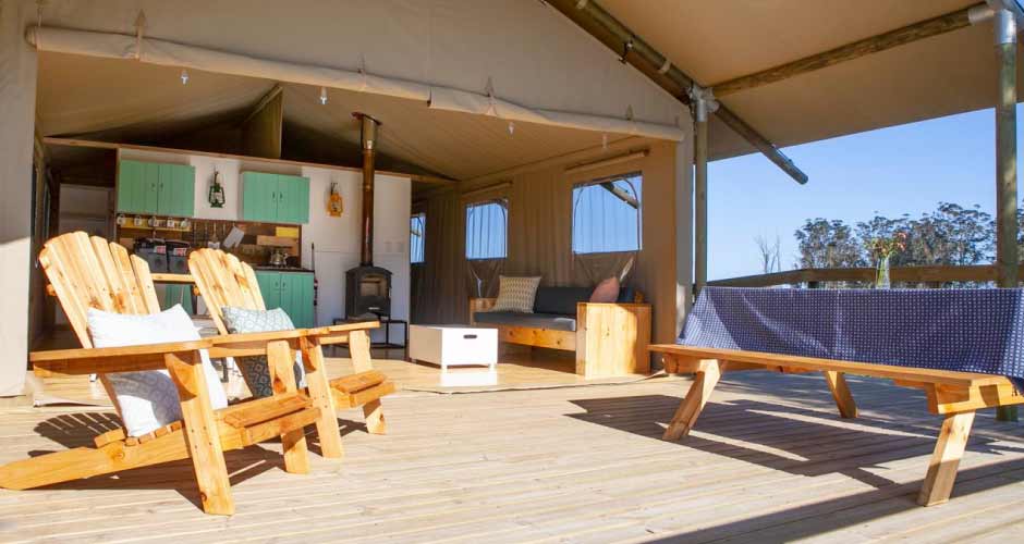 Five brand new AfriCamps luxury tents are situated in our new camp at Gowan Valley Guest Farm. The farm is truly enchanting with its rolling green hills, endless fields, and mighty river. You will experience an ‘English countryside’ feeling, whilst you are welcomed with true South African hospitality. Your gracious hosts, Deanne, and Brett Bouwer farm Nguni Cattle and Golden Kiwis on the property as well as running their guest farm.