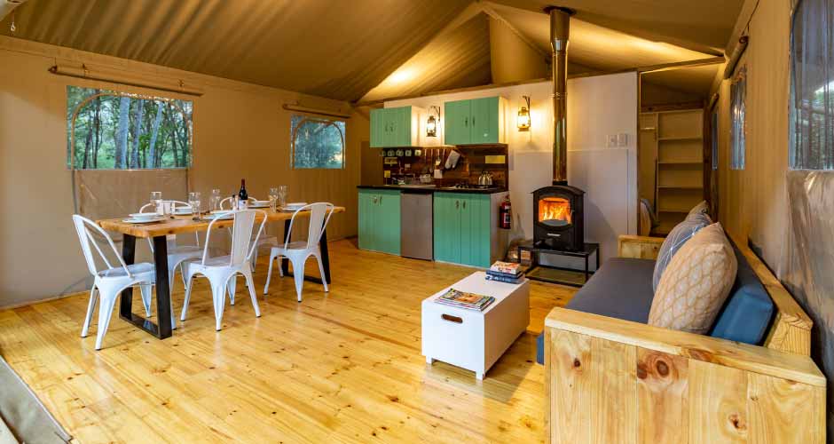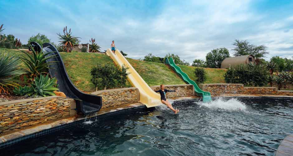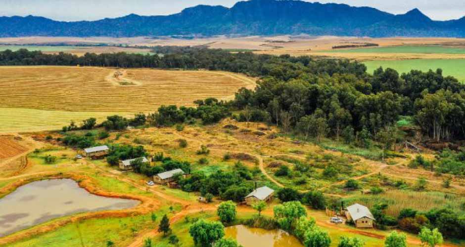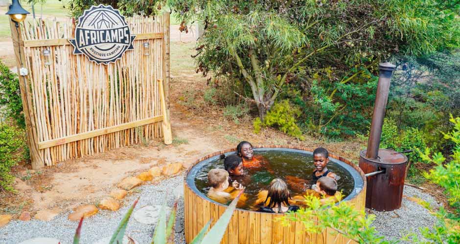 The river is perfect for canoeing and fishing, and the whole family can enjoy mountain biking on the farm roads. There is a shared swimming pool with slides for the children, and outdoor wood-fired hot tubs next to each tent, while the picturesque town of Swellendam is only a short drive away.