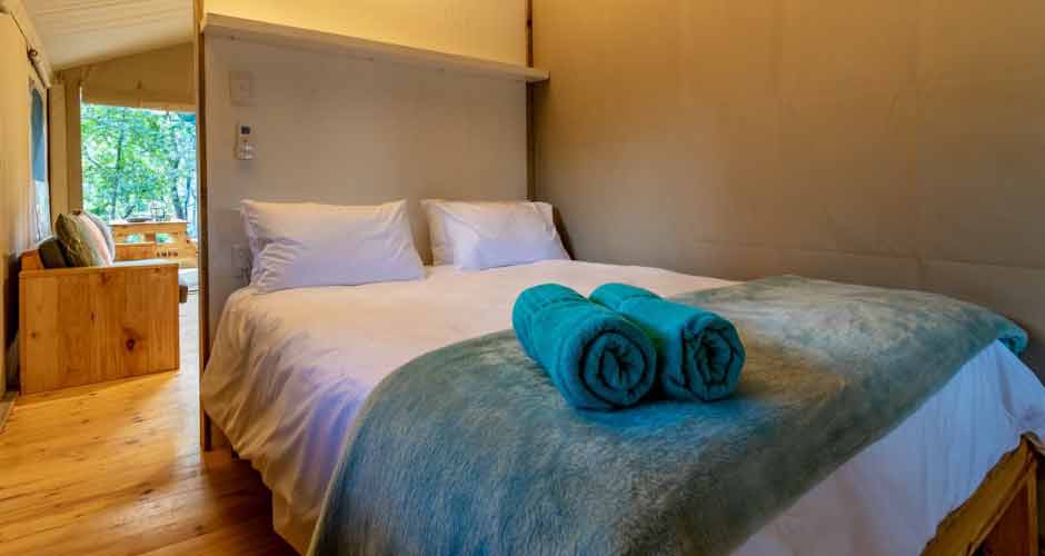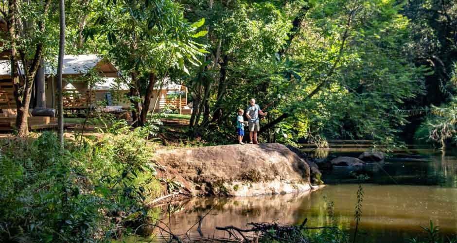 Our luxury boutique glamping tents are all facing the river just a few meters from the streaming water and are surrounded by lush green grass and indigenous forest. The camp is just a few minutes’ drive from Hazyview, a small farming town that is famous for its banana, macadamia and coffee industry, but even better known for it’s easy access to the Panorama route and the Kruger National Park, two of the most popular tourist attractions in South Africa.