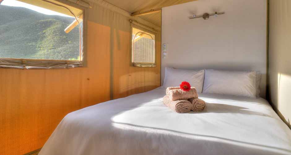 2000 Hectares of spectacular mountain fynbos with streams, mountain dams, birdlife and various animals such as bucks, fallow deer, Nguni cows and even a very shy leopard. The reserve is also home to a rare Protea Flower that was thought extinct for almost 50 years and is now under protection of Cape Nature. Our glamping tents are tucked away in the Cape fynbos and look out over a folded green valley with the Langeberg as a gorgeous backdrop. I