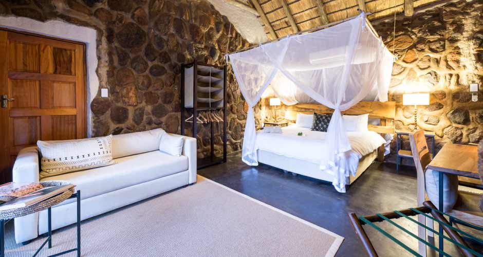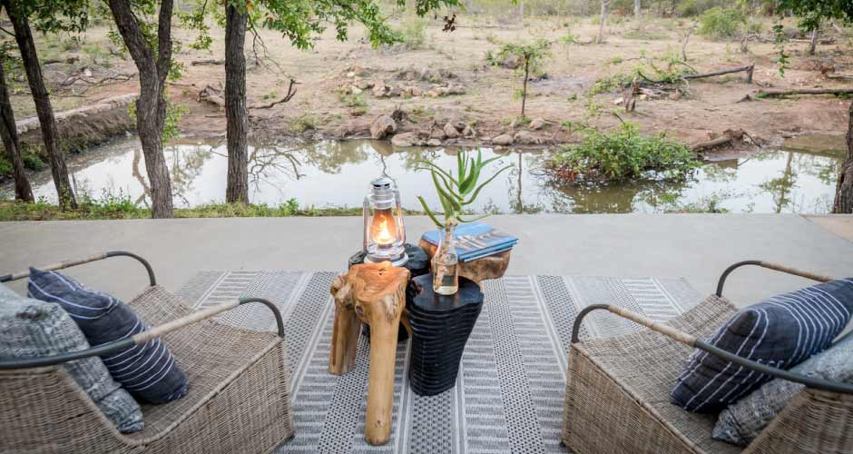 Each chalet has its own patio, en-suite bathroom, mosquito nets over the beds, tea and coffee facilities and air conditioners. Klipspringer sleeps a family of 6 people and has an outdoor shower, Steenberg chalet sleeps 3 people and is next to the main area with a direct view of the waterhole, and the Grysbok chalet has two separate rooms sleeping 2 adults and 2 children.