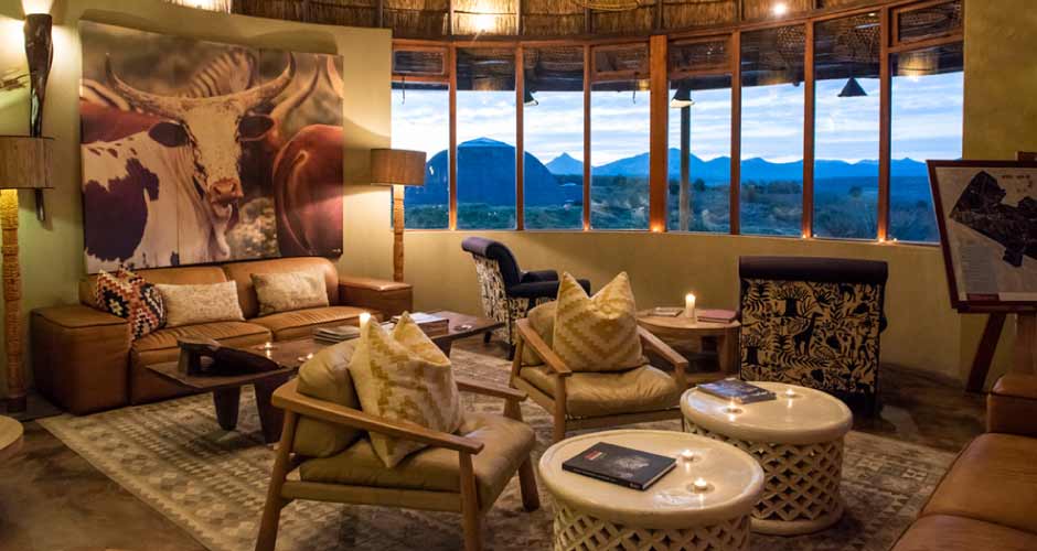 The spacious Safari Lodge Accommodation facilities include a large infinity swimming pool, chic open-plan lounge and bar, with food and beverage services offered in an elegant dining room set around two open fireplaces, the new covered veranda from which to appreciate the animal life and landscape, and the outdoor African boma (a fire pit and sitting area surrounded by a windbreak fence).
