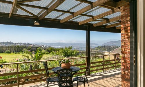 Bathroom has a bath and shower. With wraparound balconies and a deck braai (BBQ), the living area has breathtaking views of the Knysna Heads/lagoon, river and our own dam (fenced) on one side and faces two ponds (not fenced) and the gardens on the other.