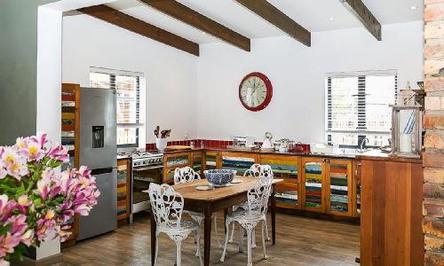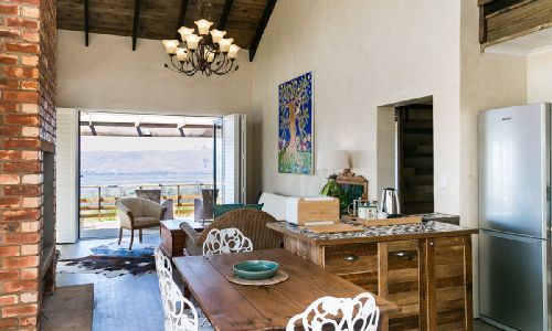 The kitchen is fully equipped – gas hob and electric oven, kettle, toaster, crockery, cutlery, pots, pans, fridge, washing machine, clothes horse, table and four chairs, easy chairs and seating on the balconies, DSTV package. Indoor fireplace and oil heater.