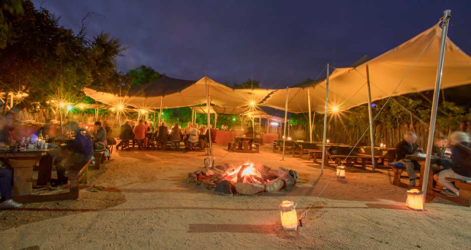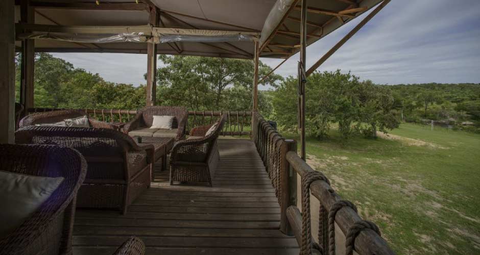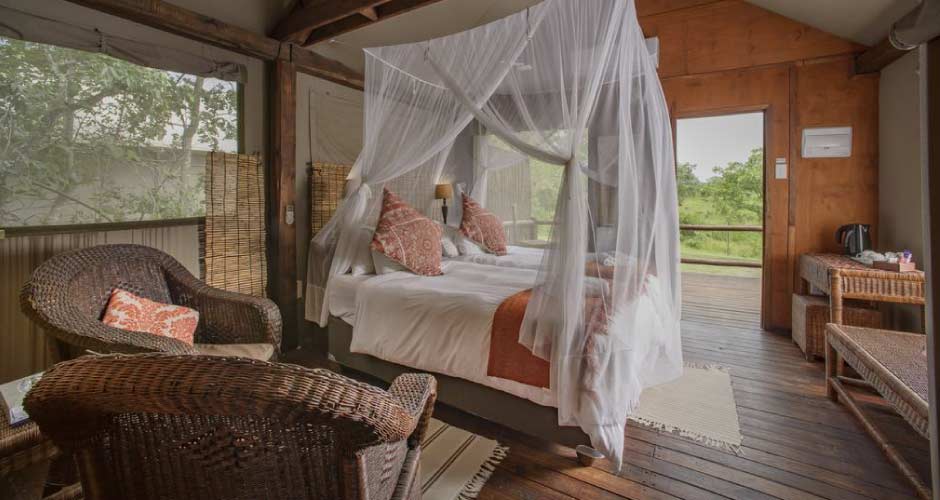 Accommodation comprises 150 comfortable tented suites, all of which have en-suite indoor/outdoor bathrooms and private outdoor decks overlooking the bush. There is a large dining area overlooking the Kruger National Park serving three delicious meals a day with an emphasis on serving hearty South African fare including an excellent selection of premium South African wines. A traditional bush barbecue (braai) can be enjoyed around an outdoor log fire in the one of the two Bomas.