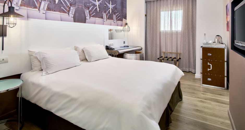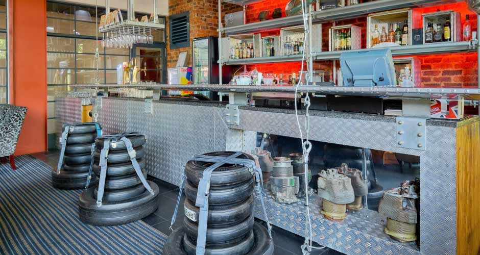 Themed around an aeroplane hangar, the industrial ambiance of the hotel is felt in the white floors, steel finishes, chrome lighting and top to bottom windows that overlook the airplanes as they dock and take off.