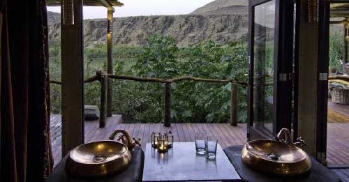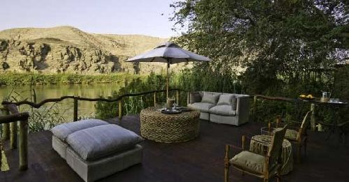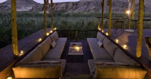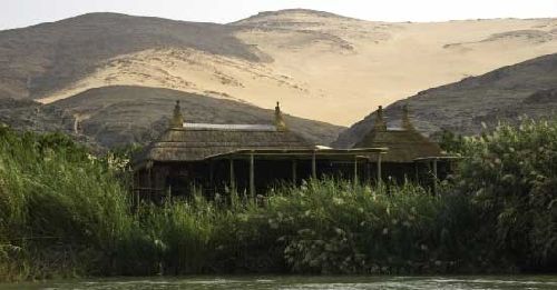 Accommodation at Serra Cafema consists of 8 riverside Meru-style canvas and thatched chalets on spacious, elevated decks blended craftily into the picturesque surroundings. Each fully furnished tent has an en-suite bathroom, ceiling fan and mosquito nets as well as bug repellent. A late afternoon spent lounging on the front deck soaking up the breathtaking vistas of this contrasting wilderness is an absolute must. Serra Cafema also has a intimate, luxurious honeymoon chalet, with possibly the best view of all. Early booking is essential owing to its popularity. Families can be accommodated by opening up adjoining chalets. The Serra Cafema Ozonganda, or main area, comprises indoor and outdoor dining areas, sunken lounge, river bar, library, curio shop and swimming pool, all sharing views of the Kunene River. There are set daily menus for breakfast, lunch and dinner with tea/coffee available throughout the day.Directions To Serra Cafema
