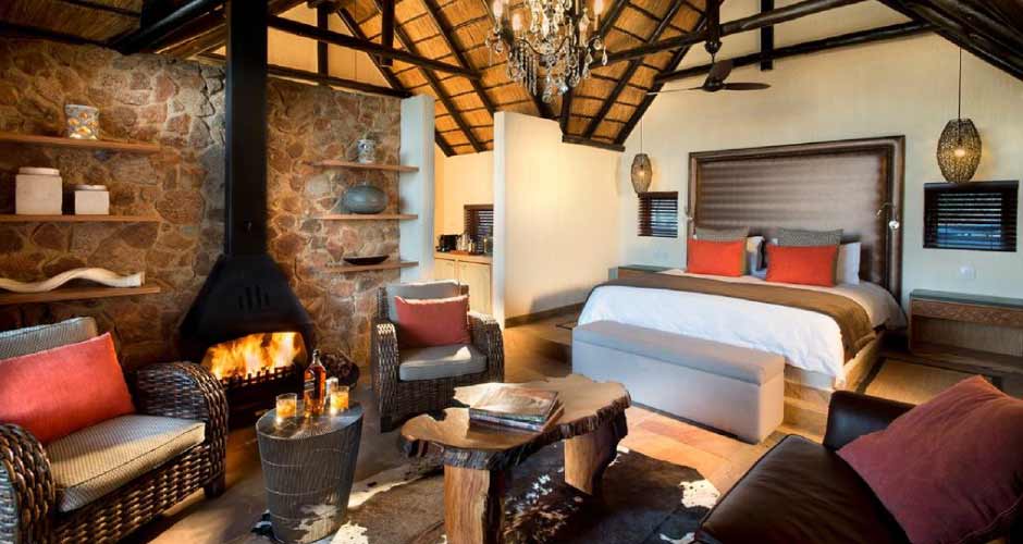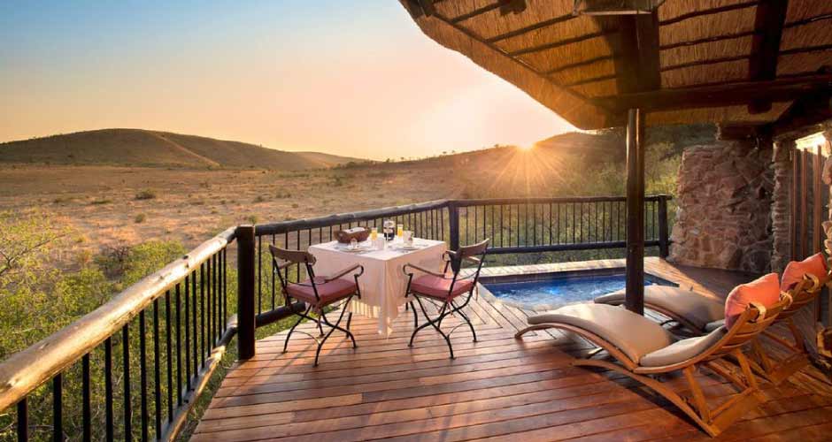 The 4 Luxury suites feature crystal chandeliers, a rock craft fireplace as well as a private heated plunge pool on a private deck overlooking the bush below. Guests can relax in their open plan lounge and watch the animals wander aimlessly through the bush before reaching the waterhole located below the lodge. After dinner take a leisurely stroll back to your private chalet and sit and watch the stars navigate the African sky. Tshukudu Bush Lodge is situated in a malaria free area. Please note that there are over 100 rocky steps leading up to the lodge.